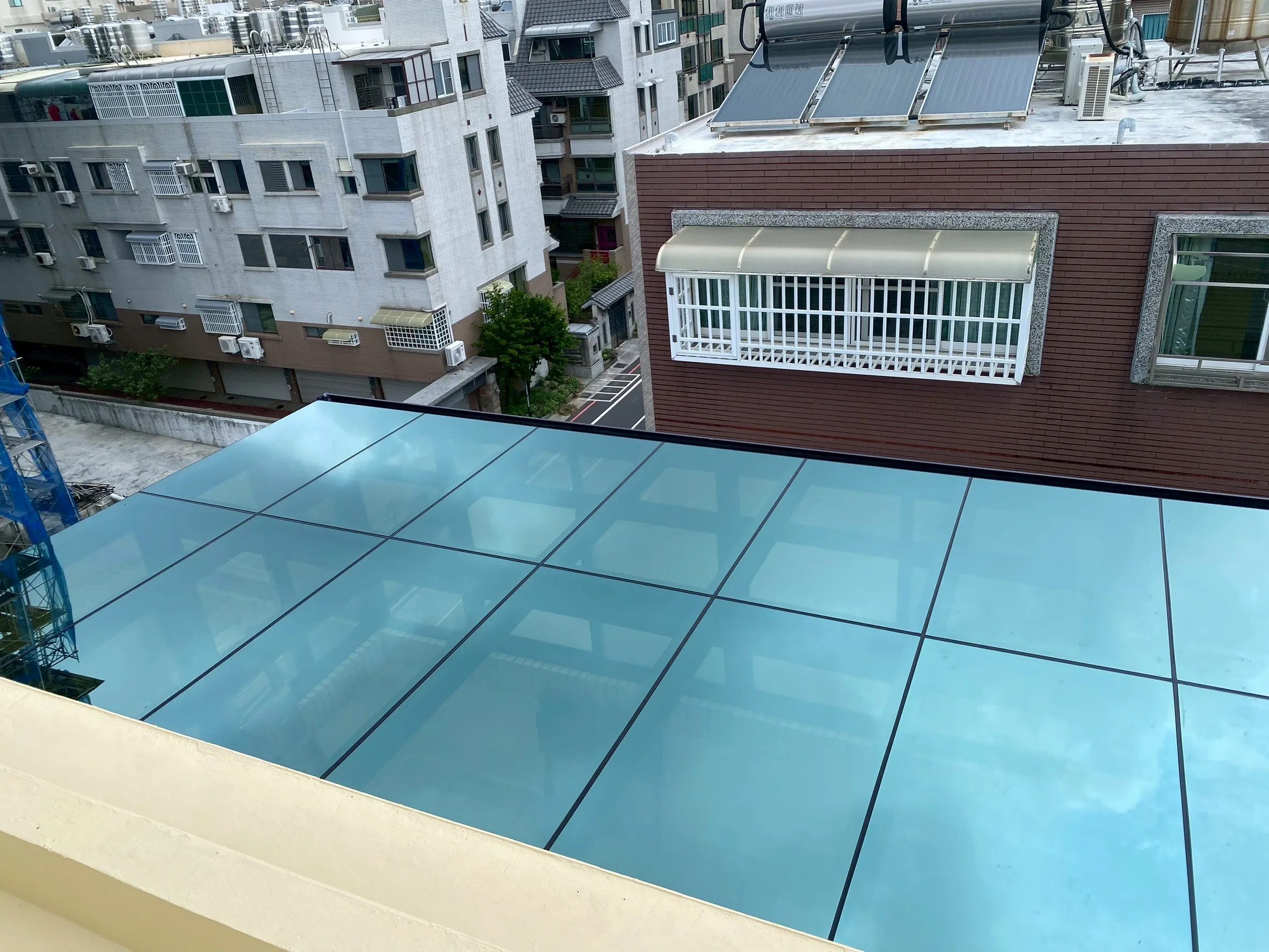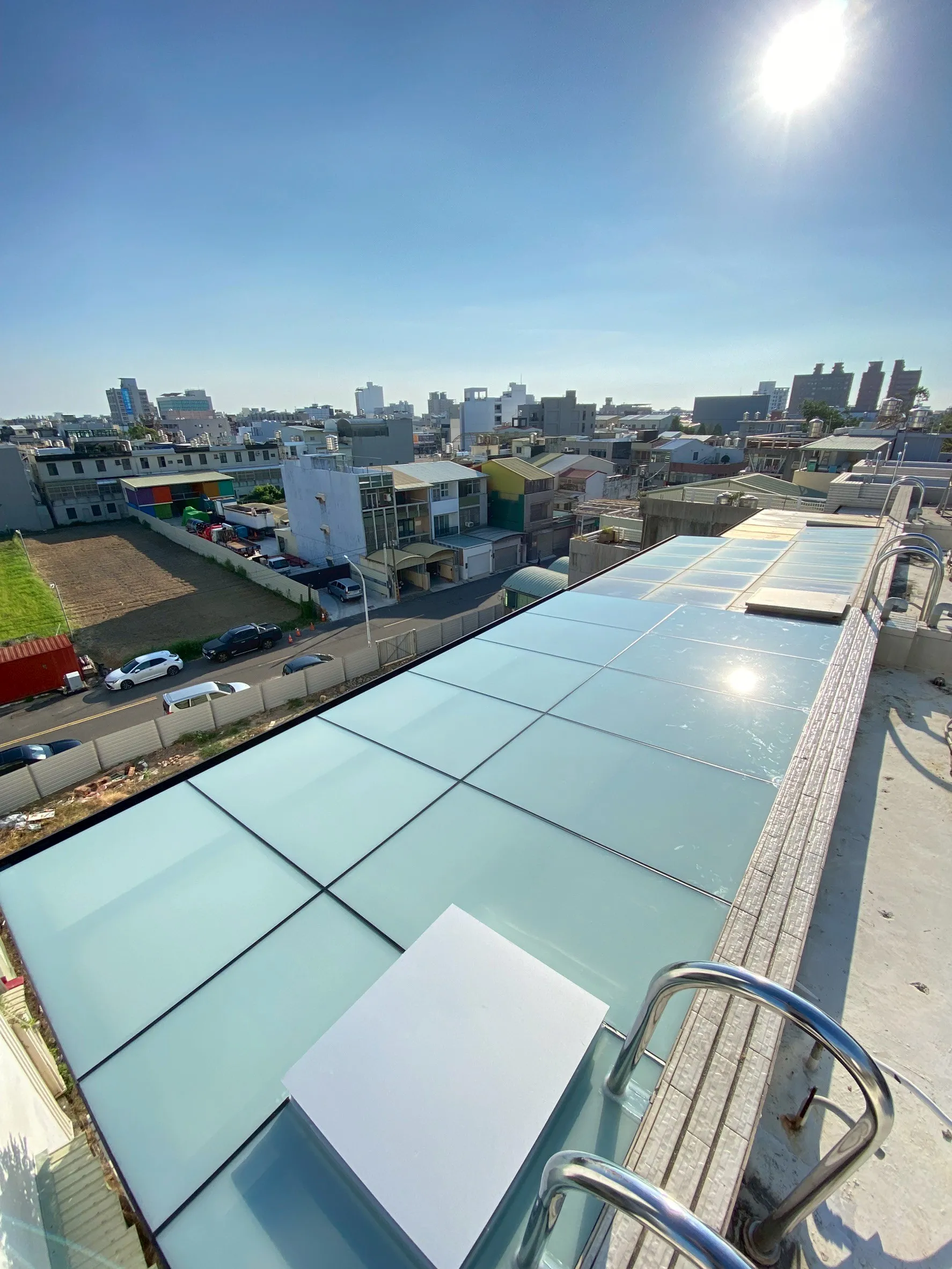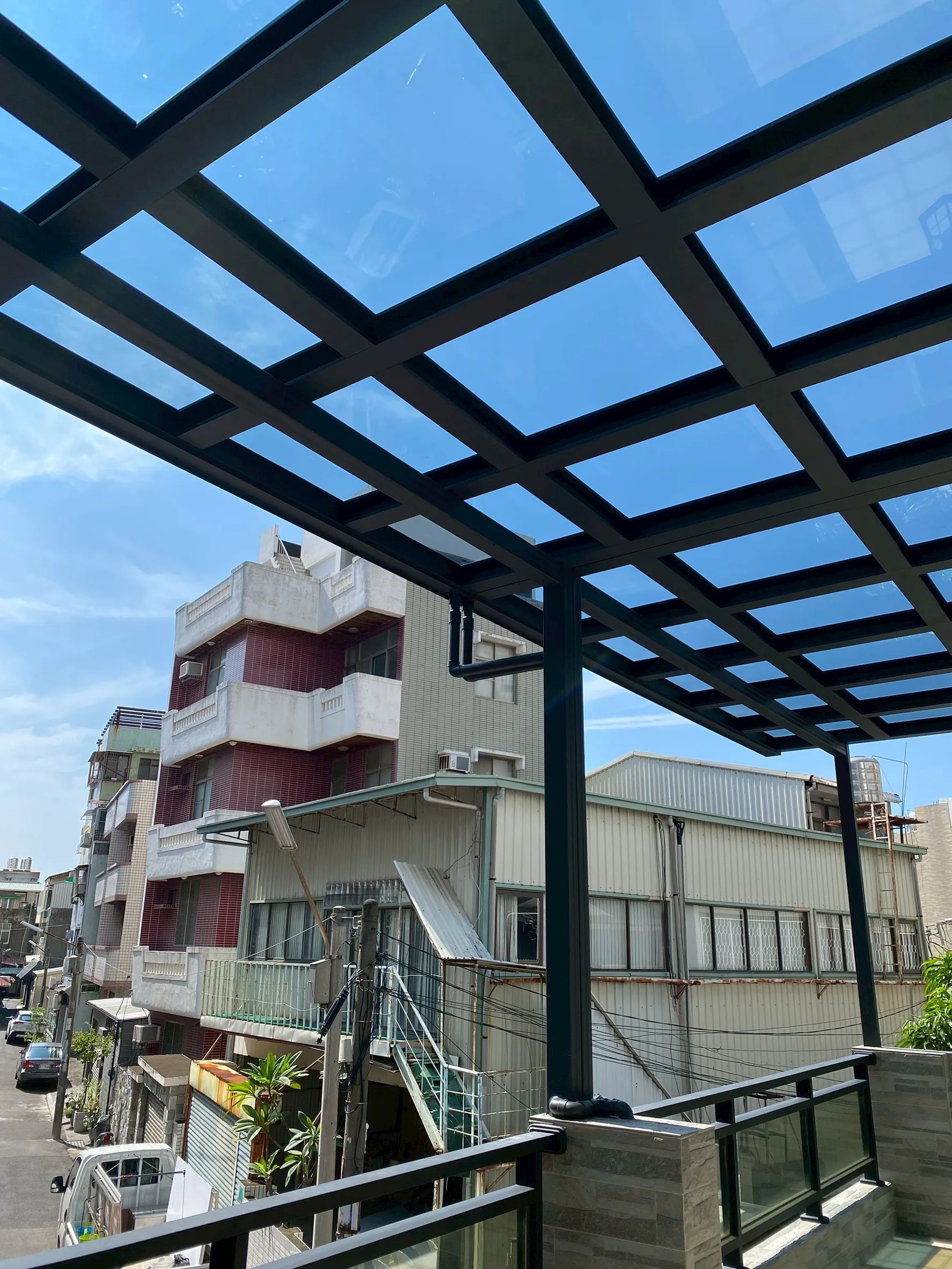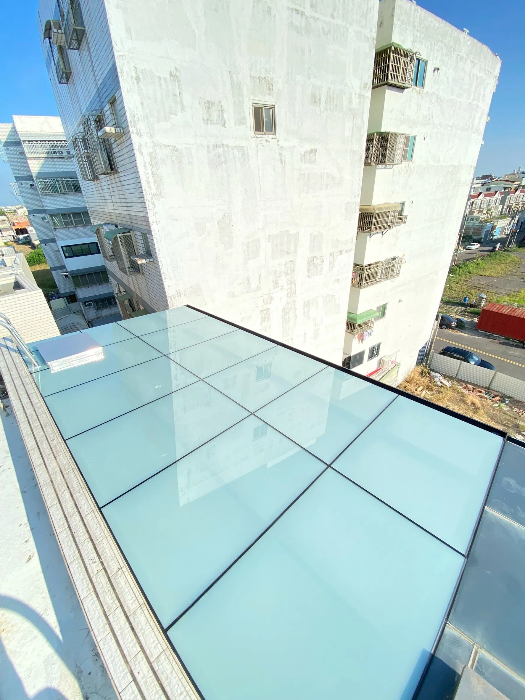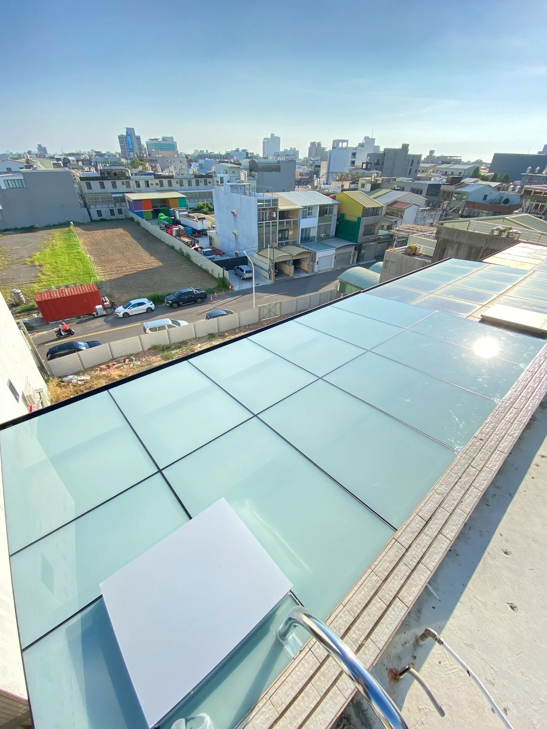 5綠半反+5光+光膜膠合安全玻璃 玻璃採光罩|台南玻璃工程
